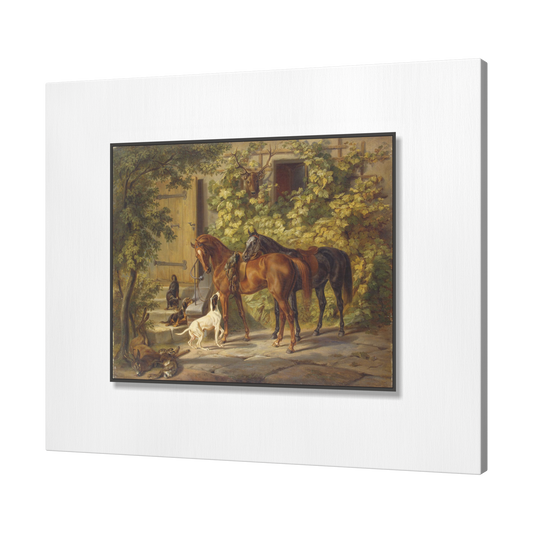 Horses at the Porch (1843) by Albrecht Adam: A Large Vintage Horse Painting on Canvas